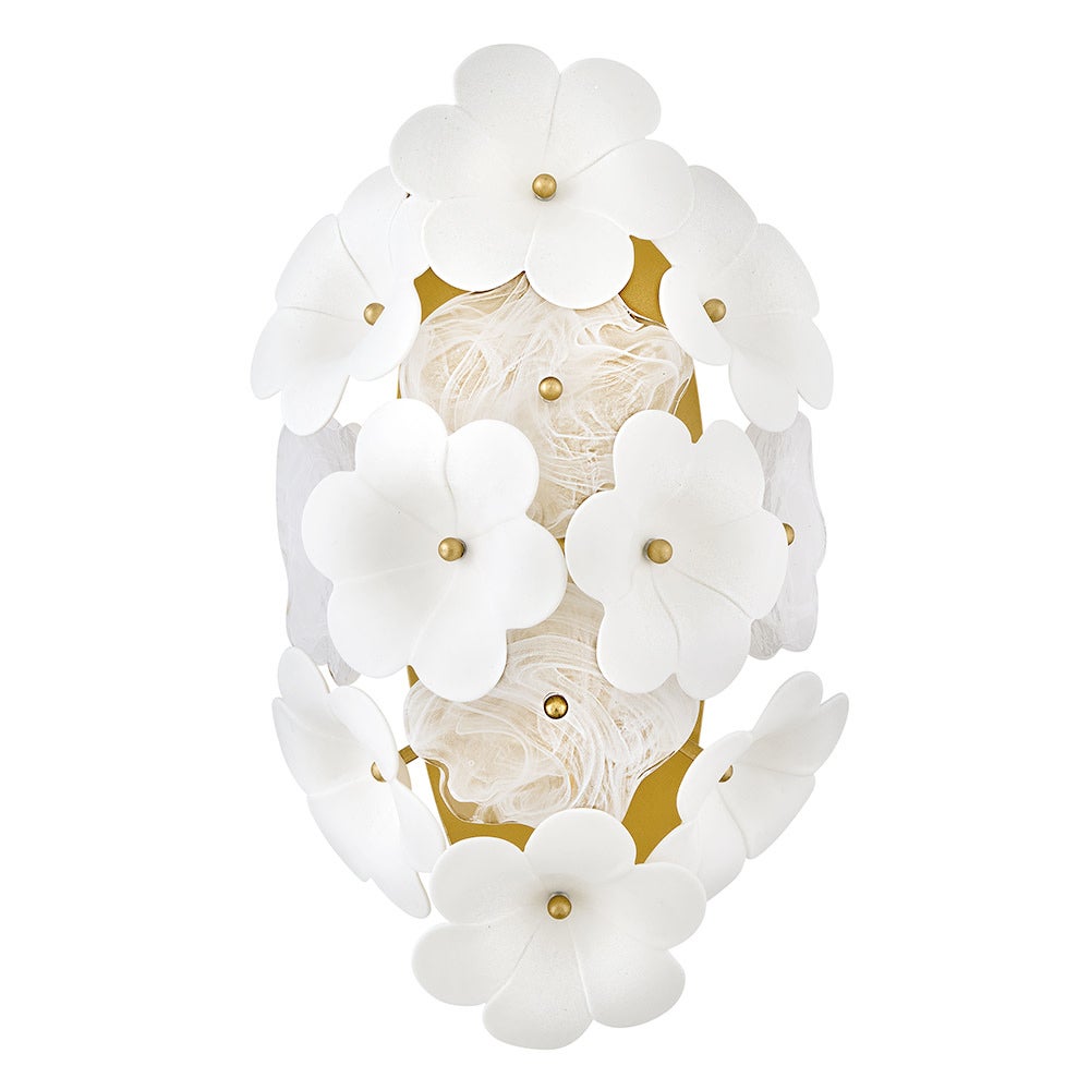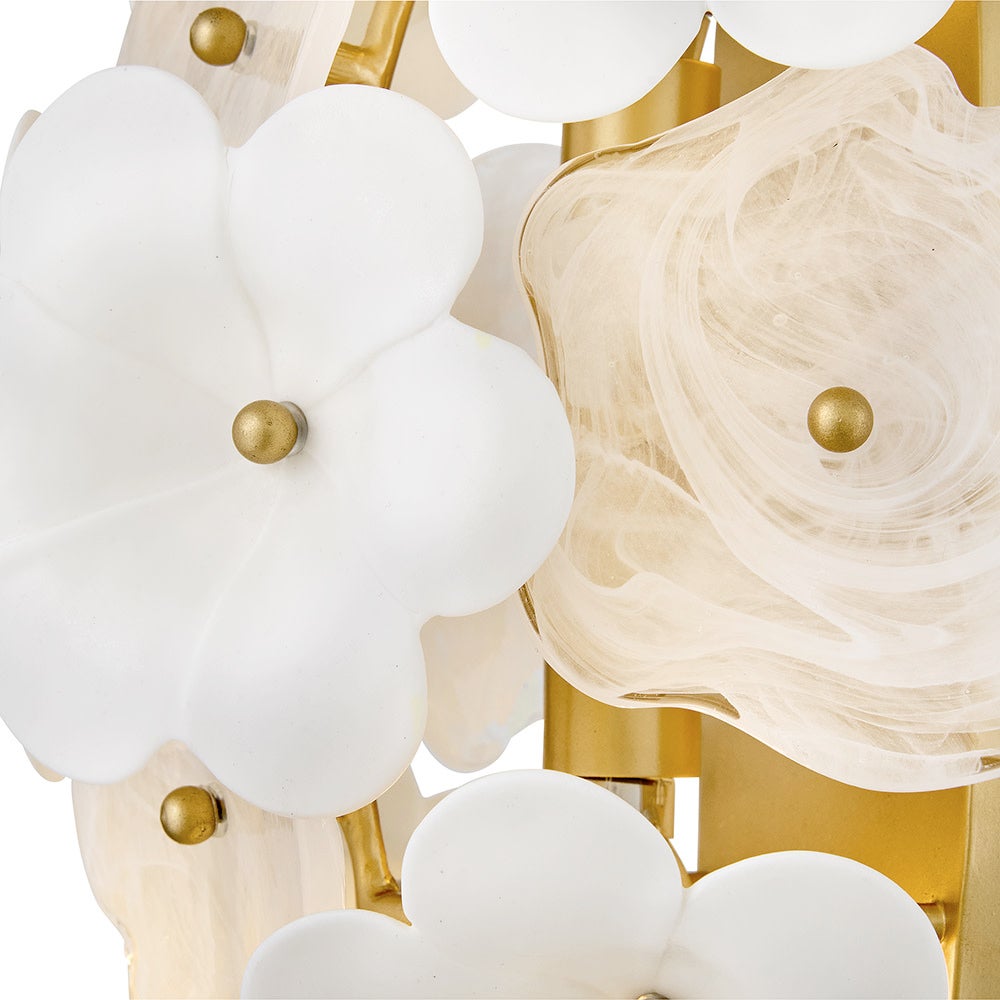 Decadently arranged in glamorous clusters, Marianne’s wispy-patterned white glass and ceramic blossoms create an elegant organic silhouette enhanced by a luxurious glow. Intricate frames in our Deluxe Gold finish capture warm inviting illumination.