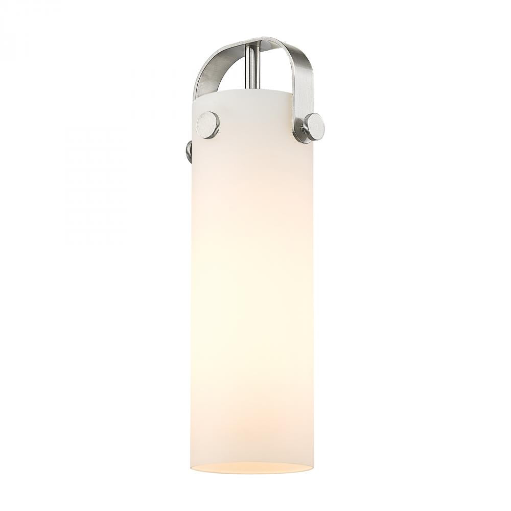 Set against the wall, light from a sconce shines through a slim glass column that feels crisp and architectural. A gentle arch lifts the shade forward just enough to flatter faces and hallways. Subtle metal accents introduce a crafted note without stealing attention from the glass. Scaled for versatility, it perches neatly beside artwork, mirrors, and doors alike with its modernized industrial style.