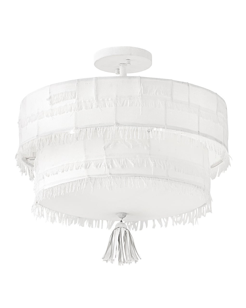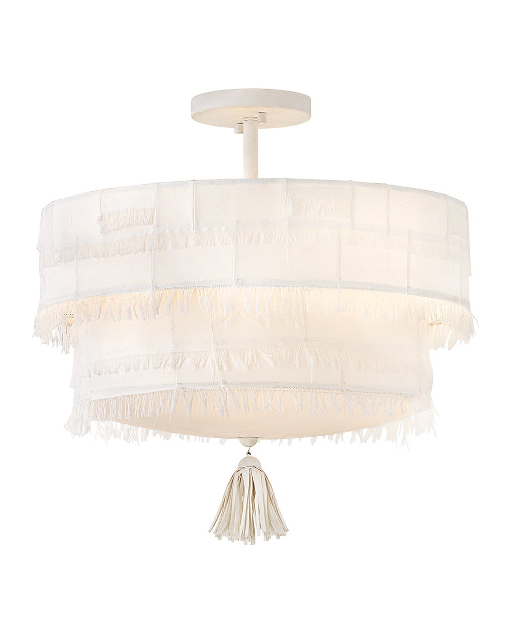 Taking a nod from current distressed fashions, Baya’s soft, hand-sewn patchwork shade creates a light and elegant feeling. Its coastal cottage style and chic texture make an artsy transitional statement complemented by a leather tassel, comfortable dimmable lamping, and a Textured Plaster finish.
