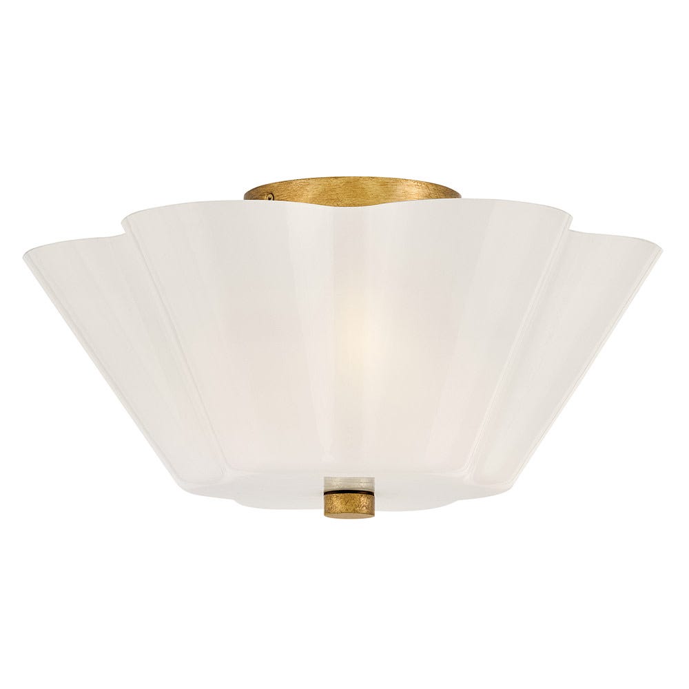 This semi-flush ceiling light blooms gently across the ceiling, its scalloped glass shade recalling the soft petals of a flower catching the light. Cased opal glass mellows brightness into a diffused glow that is kind to bedrooms, hallways, and living areas where comfort matters most. The shorter stature makes it an elegant alternative to basic ceiling fixtures in spaces where a hanging pendant might feel intrusive.