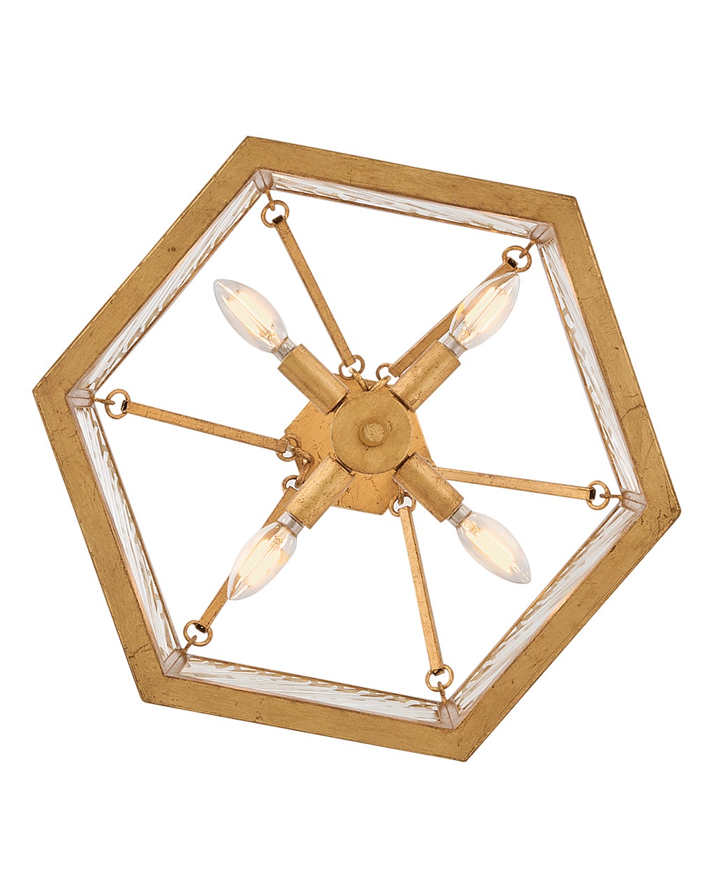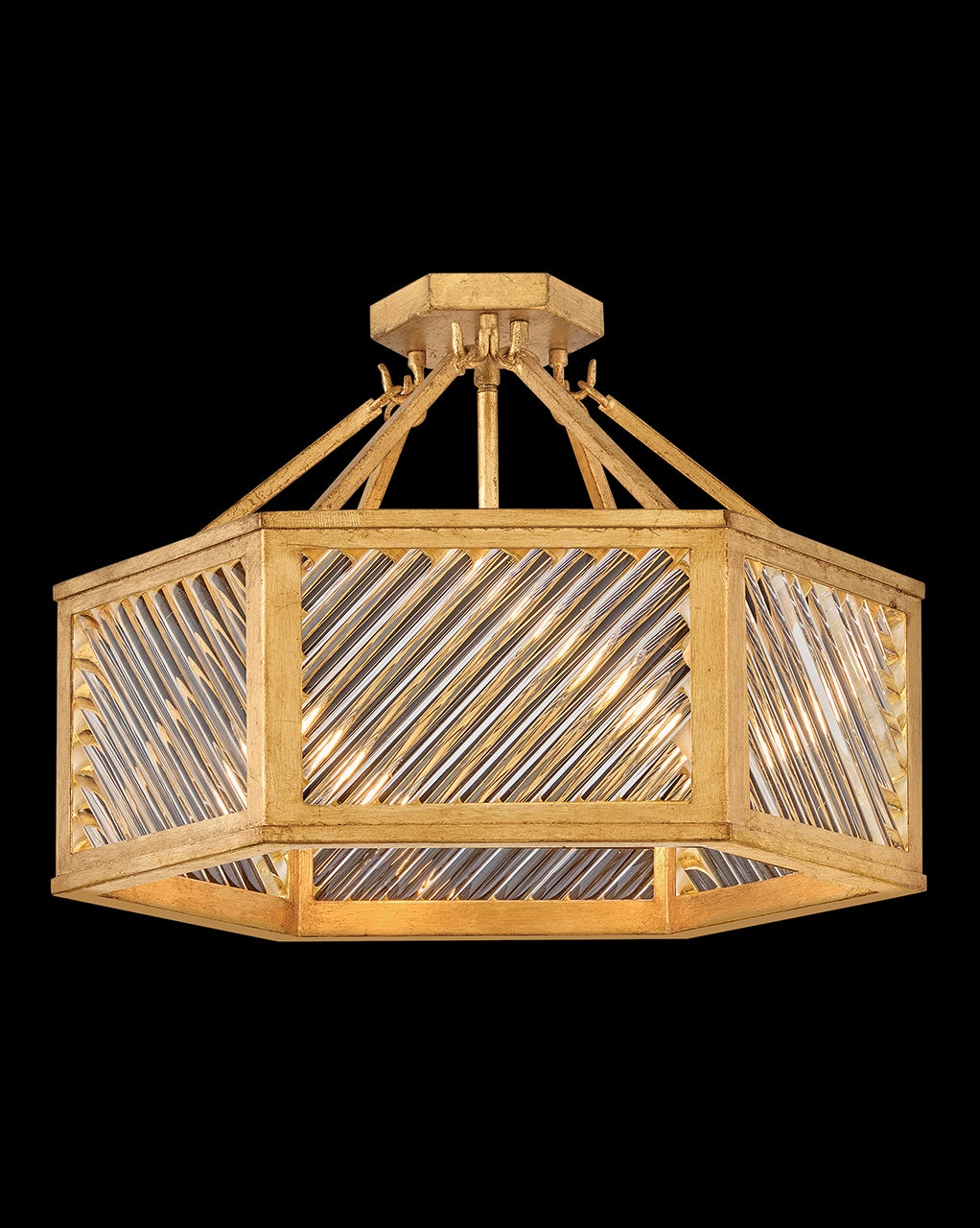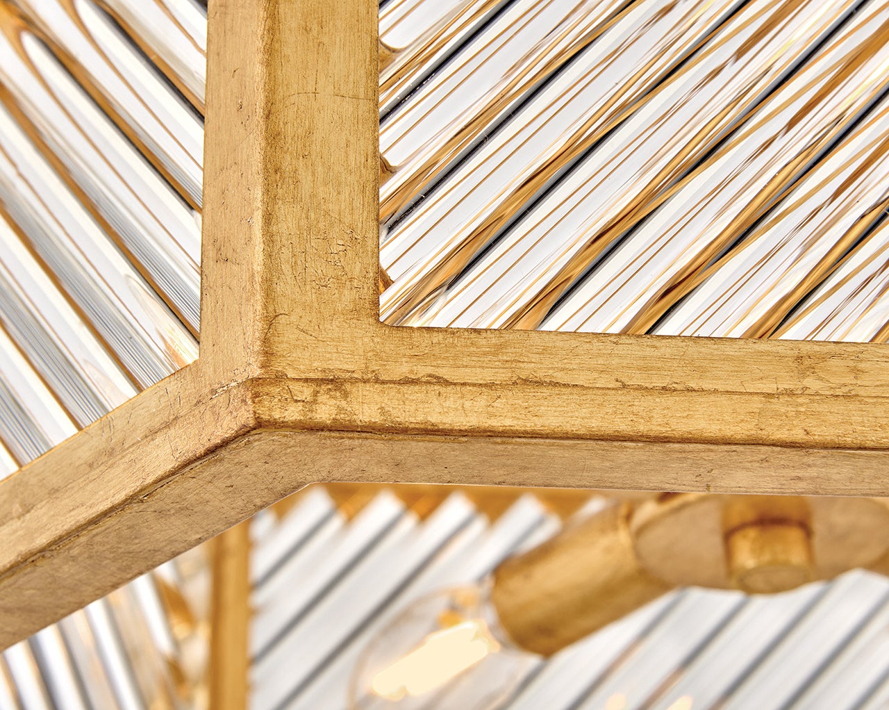 A reimagining of vintage designs from the 40s and 50s, Sura’s transitional, hexagonal Distressed Brass frame creates a glamorous yet understated and tailored appeal. Cylindrical glass rods set at alternating angles echo a soft herringbone pattern, juxtaposing geometry within geometry. Layered details create a reeded effect that is reflective and alluring.