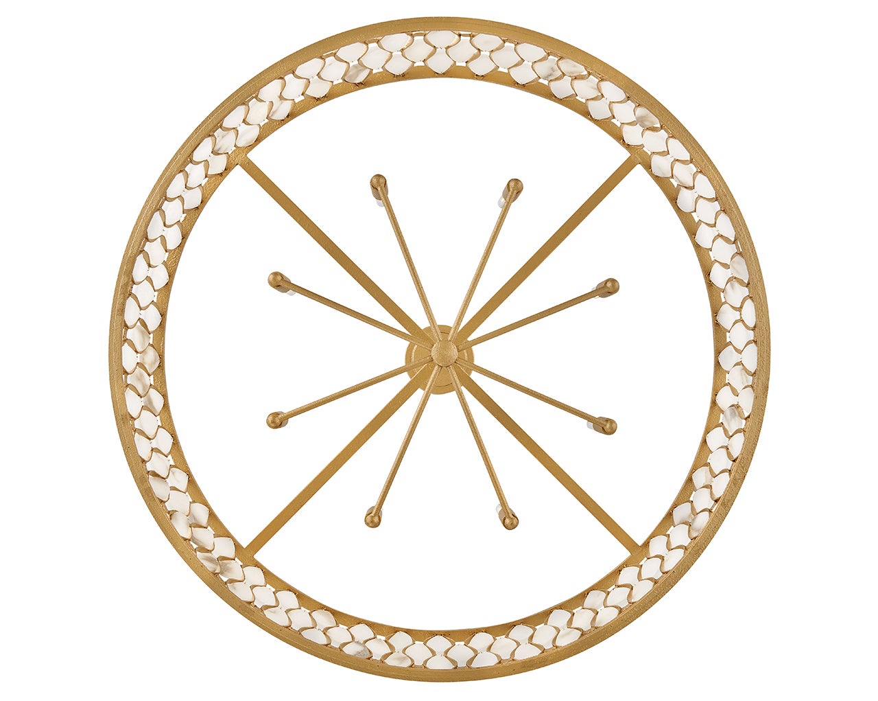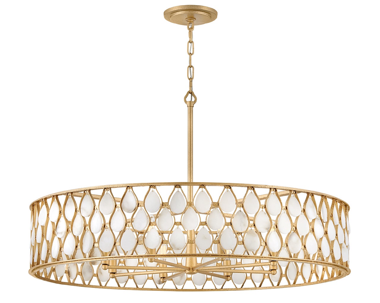 Opulently adorned with natural alabaster stones held within a traditional latticework shade, Estie brings organic elegance to any aesthetic. Intricately curved metalwork complements the frame, chain, and canopy in a textured Piastra Gold finish.