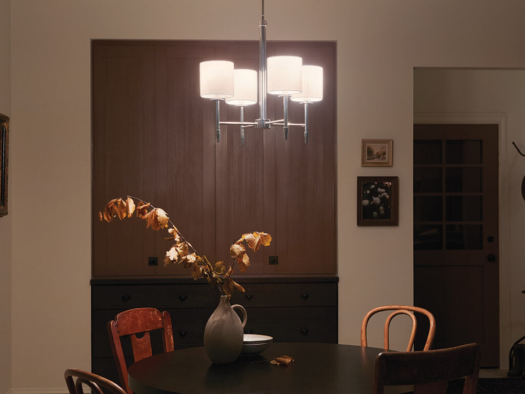 - A petite four-light fabric-shade chandelier brings gentle charm to intimate nooks