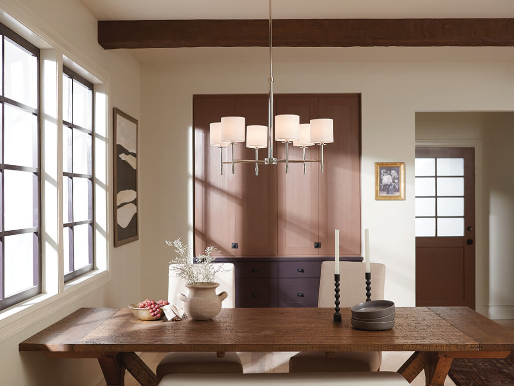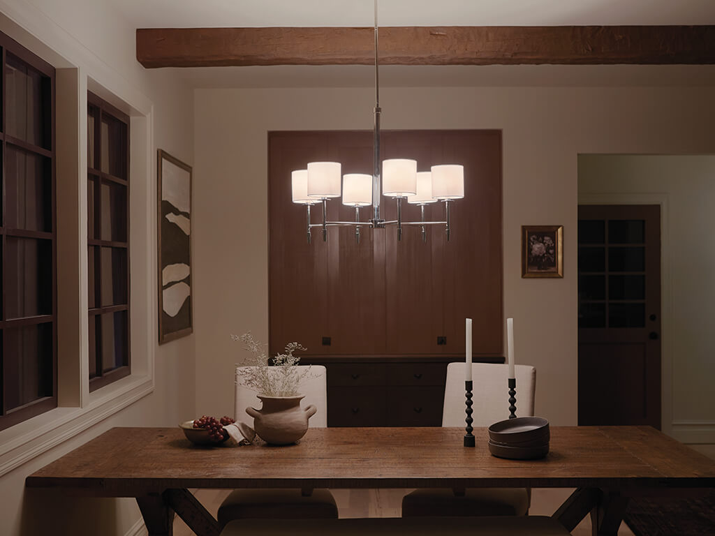 - A six-light fabric-shade chandelier illuminates gatherings with its refined, welcoming glow