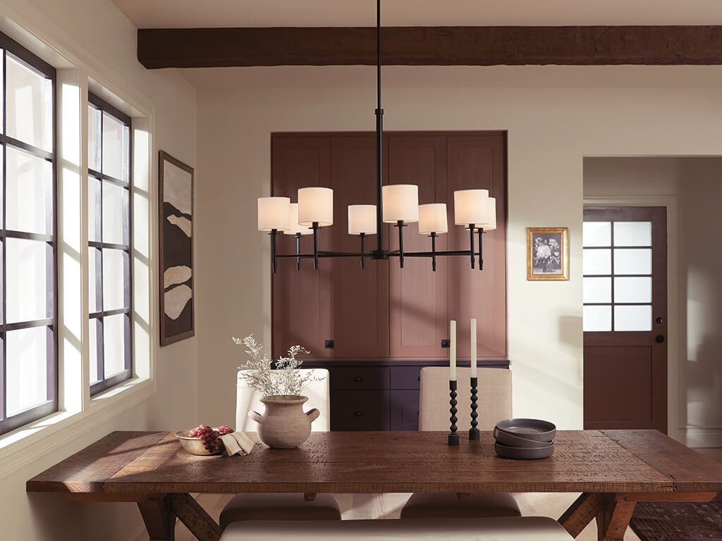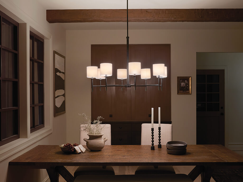 - An eight-light fabric-shade chandelier anchors rooms with tailored warmth