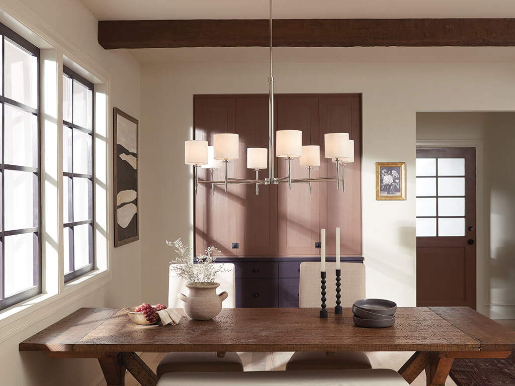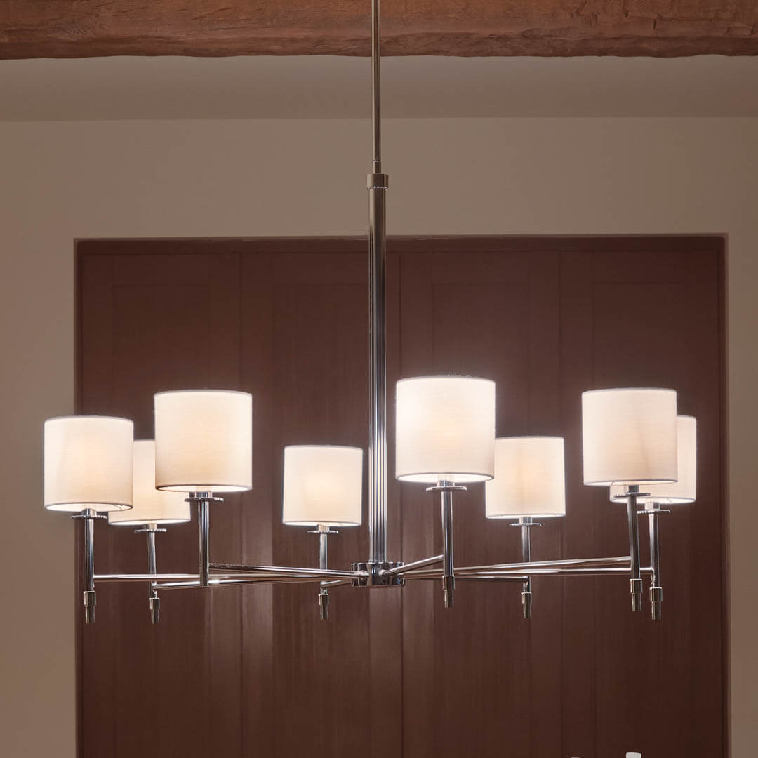 • An eight-light fabric-shade chandelier anchors rooms with tailored warmth