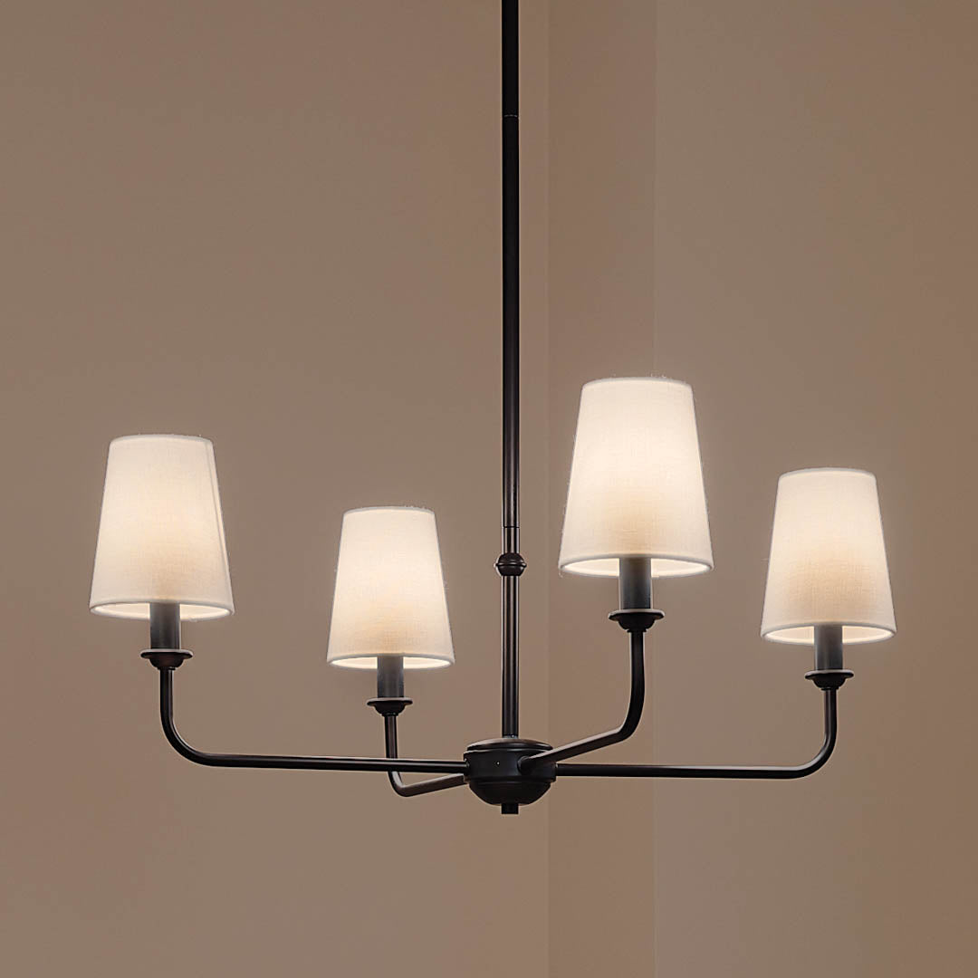 Put finishing touches on your home's traditional aesthetics with this charming four-light chandelier. Featuring a steel frame, it showcases a round profile with gently curving arms that host candelabra lights and tapered linen shades that can be removed to provide a fresh look. t's a great choice in a breakfast nook, inviting entry, or even in your bedroom.