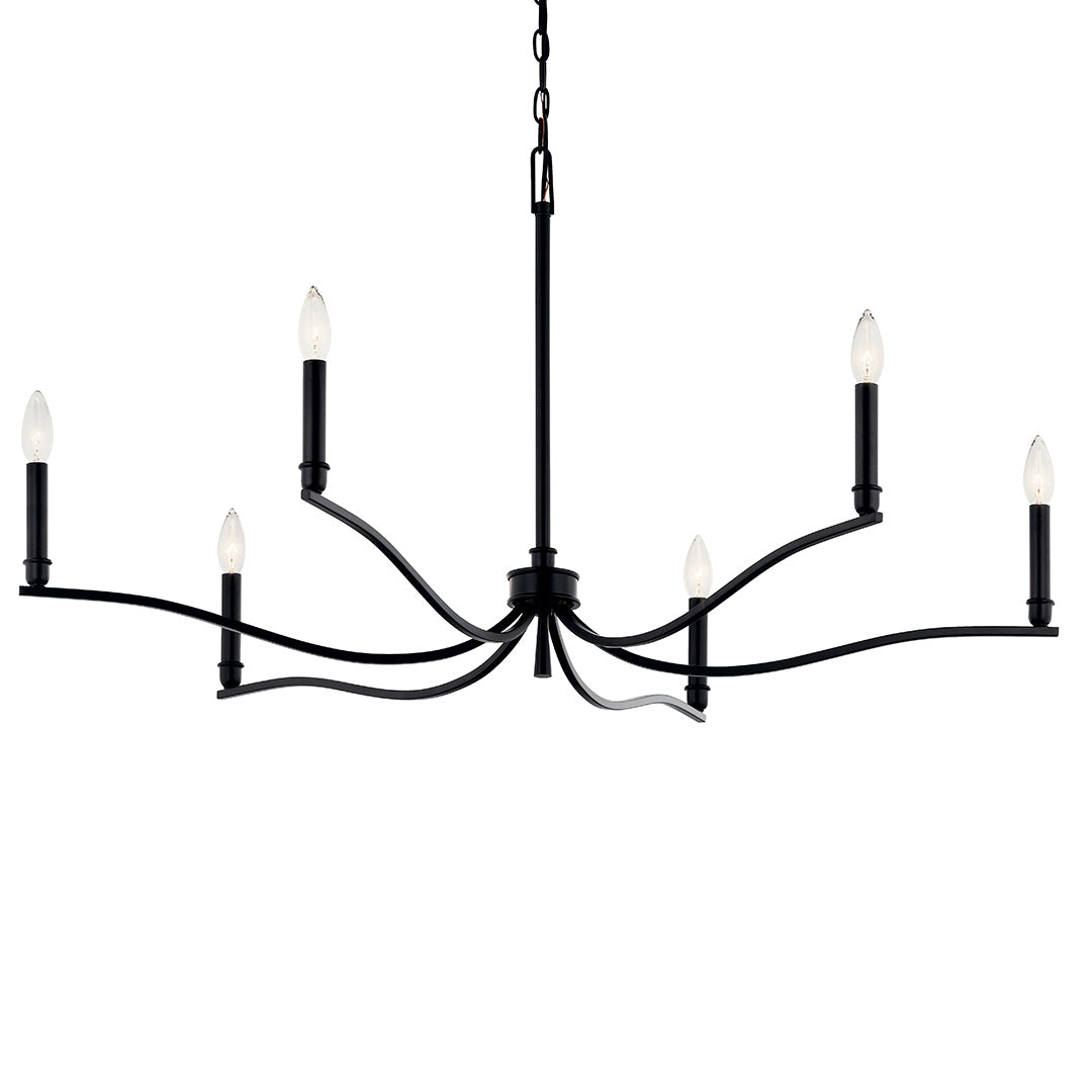 The delicacy of gently curving arms pairs with slim candles to create the graceful profile of this transitional six-light chandelier. Beautiful over a living or dining room, it features candelabra bulbs left bare for bright, inviting illumination. Its curves arms are inspired by the soft ripple of flowing water, adding organic character in an updated but ultimately familiar silhouette.