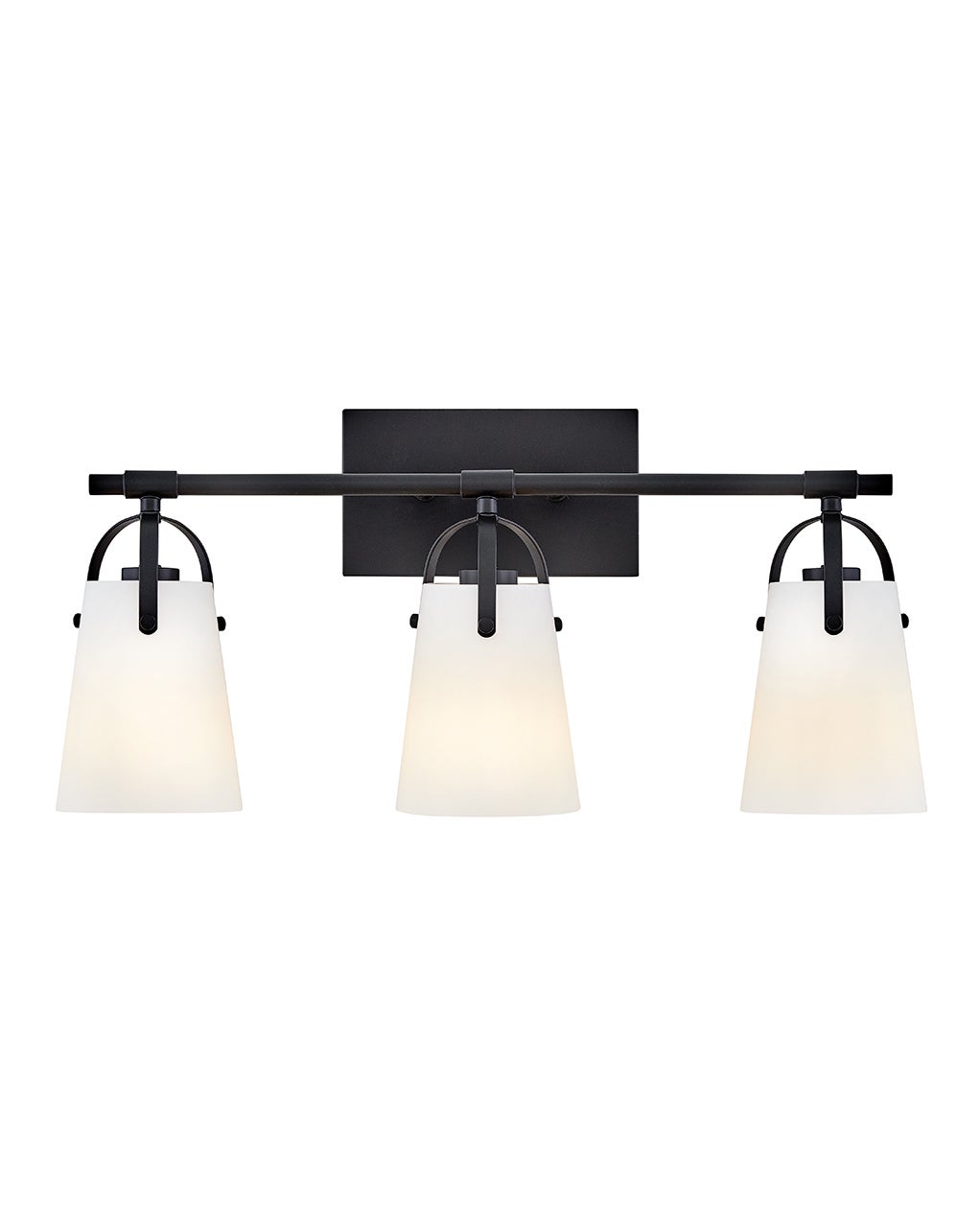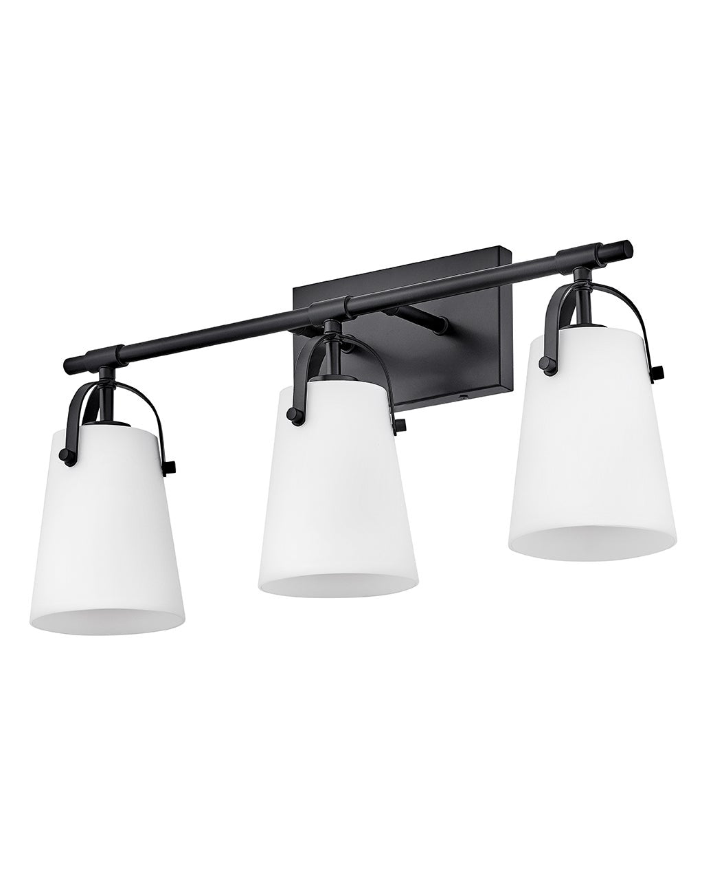 Tapered glass and arched handles bring modern industrial character to this stylish three-light vanity fixture. Offering bright, direct illumination that's never harsh, it features a crisp designer finish over a decorative frame that includes a rectangular wall plate and slim post from which each light suspends. It adds versatility with the ability to mount with lights up or down to best suit your space.