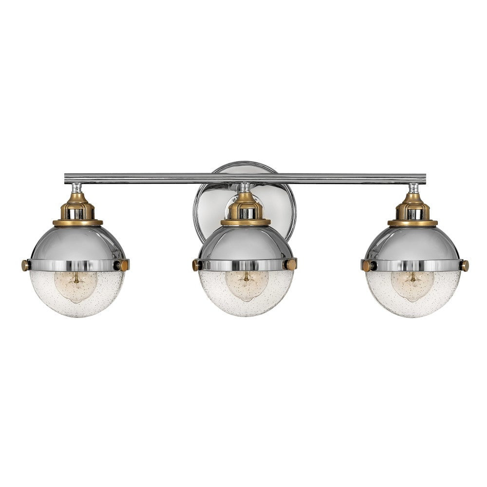 - A two-tone finish perfectly enhances the industrial details of a three-light orb vanity