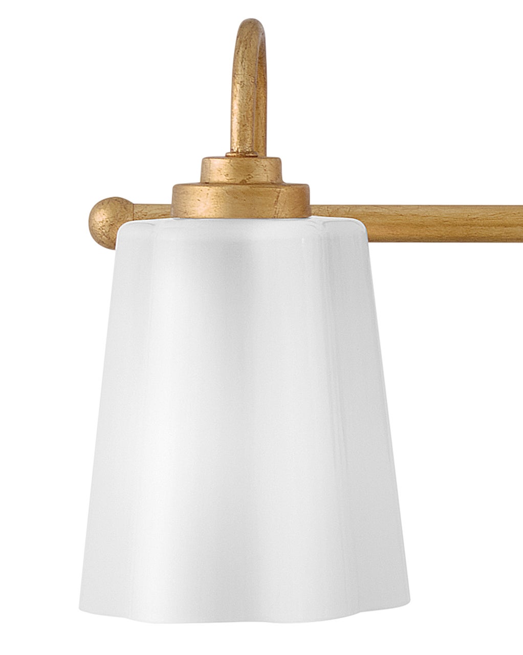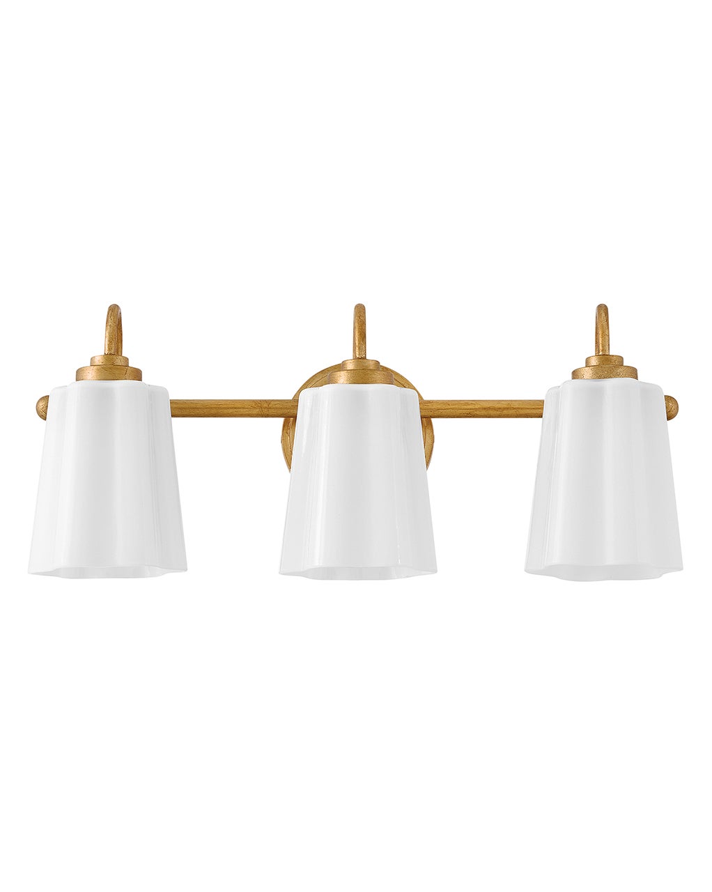 - A graceful three-light bathroom vanity fixture bathes larger mirrors in inviting illumination