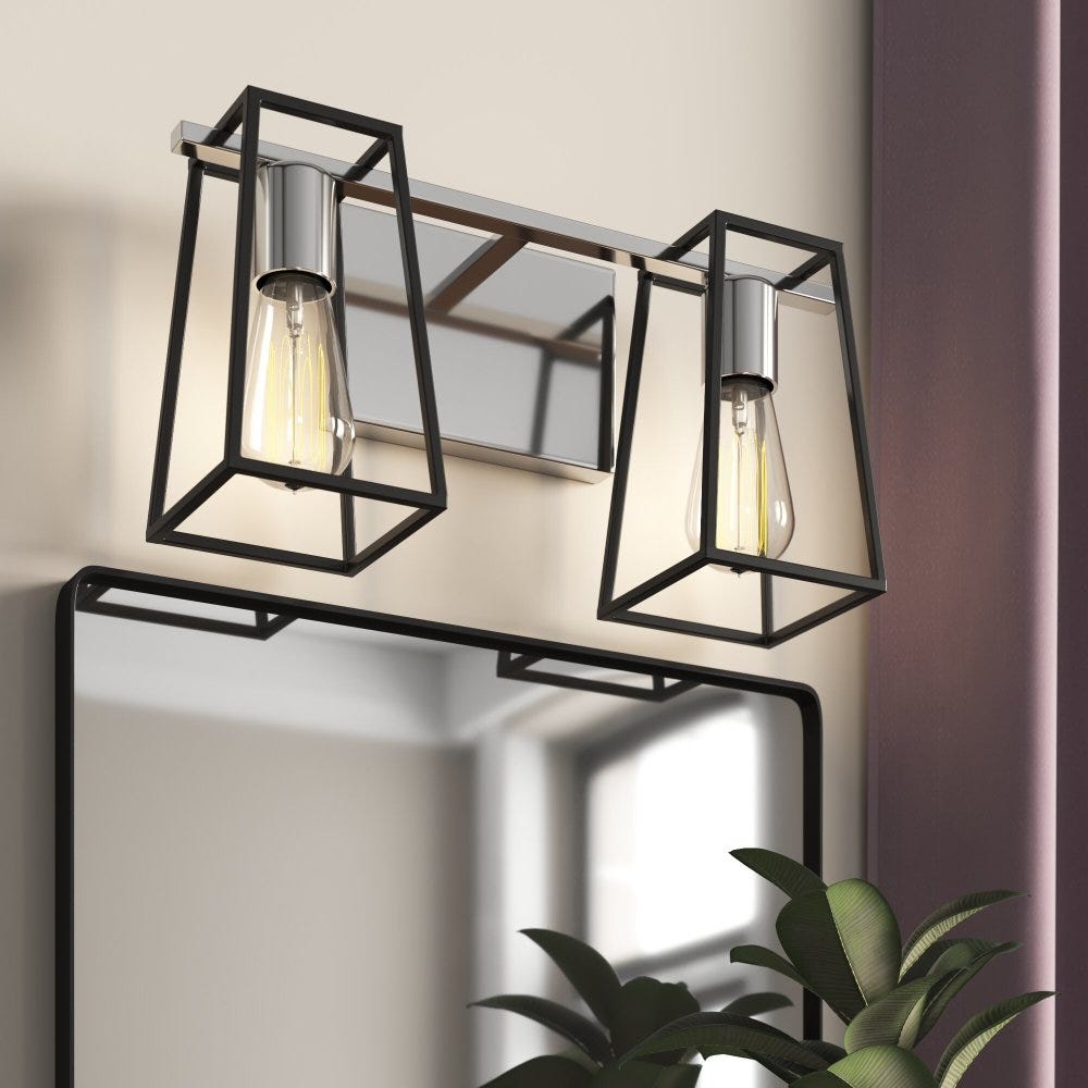 - Subtle industrial flair infuses this charming two-light vanity