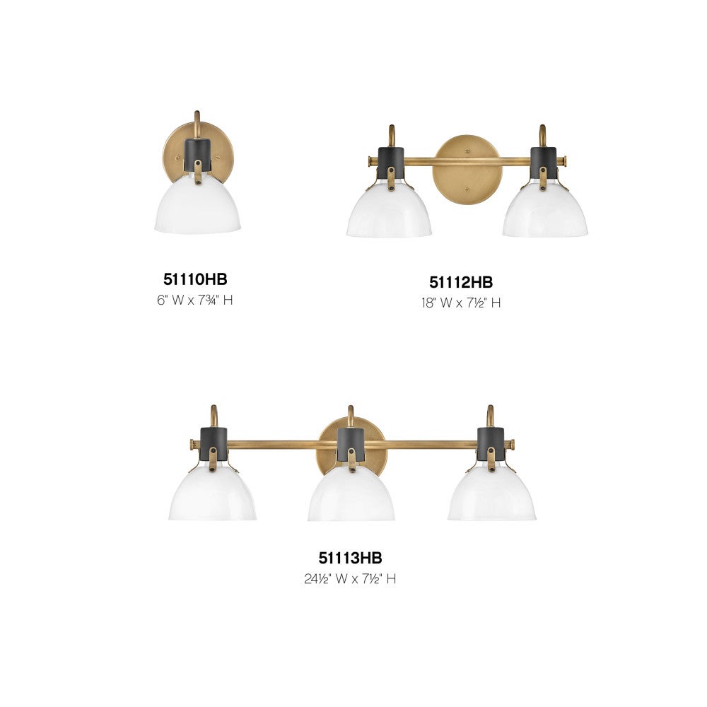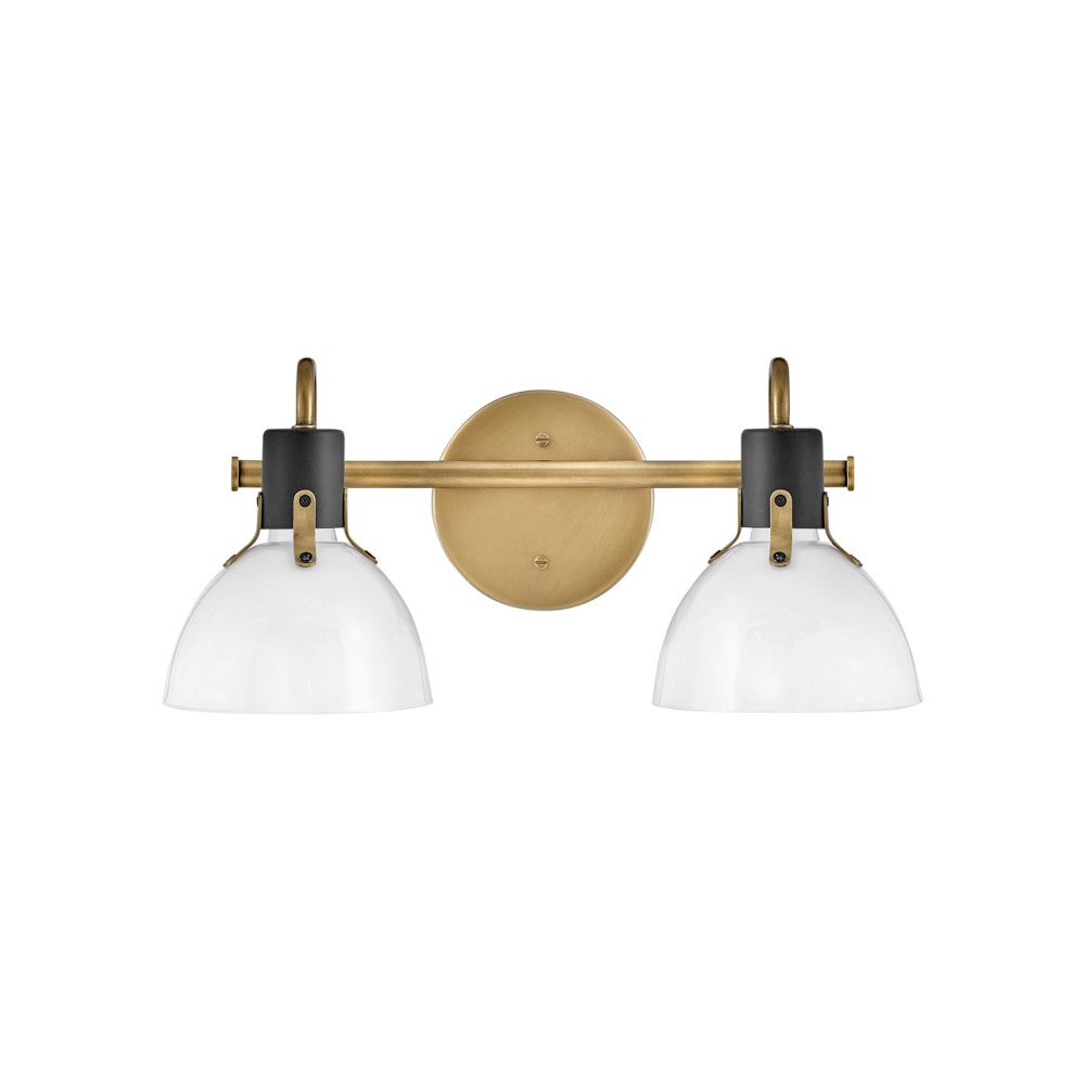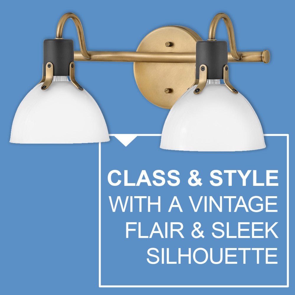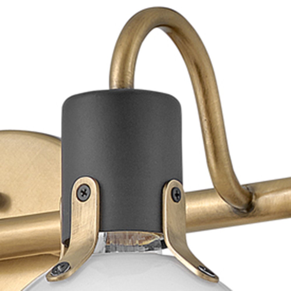 Two-tone finishing in heritage brass with black accents creates exceptional depth and flair for this transitional two-light vanity sconce. Its vintage industrial style comes through in opal glass and decorative hardware details that offer interest and textural appeal over your sink or bath. A slim post and round wall plate complete the look. Choose lights up or down to create the right look in your home.