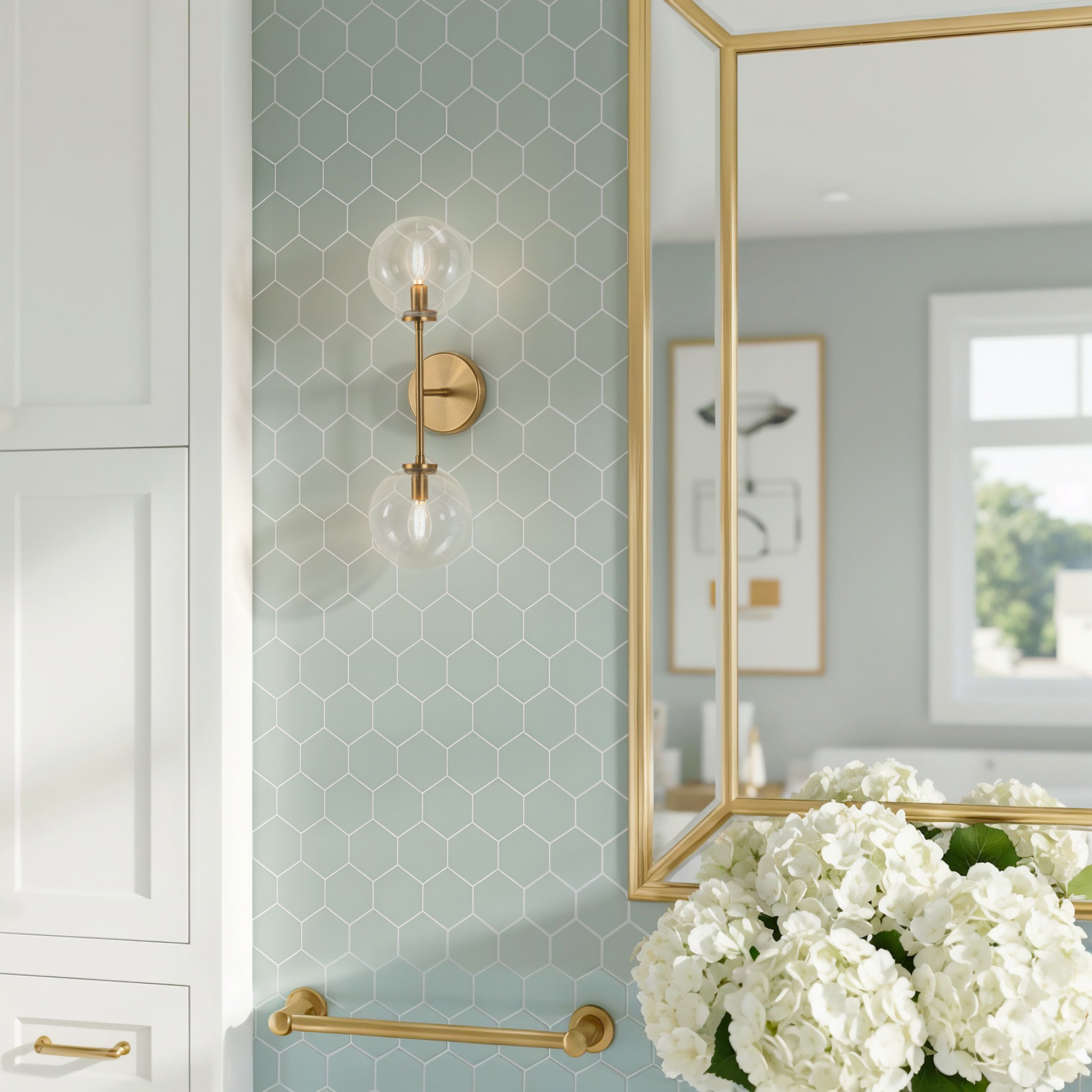 - A two-light wall/vanity light brightens above and below to lift the whole space