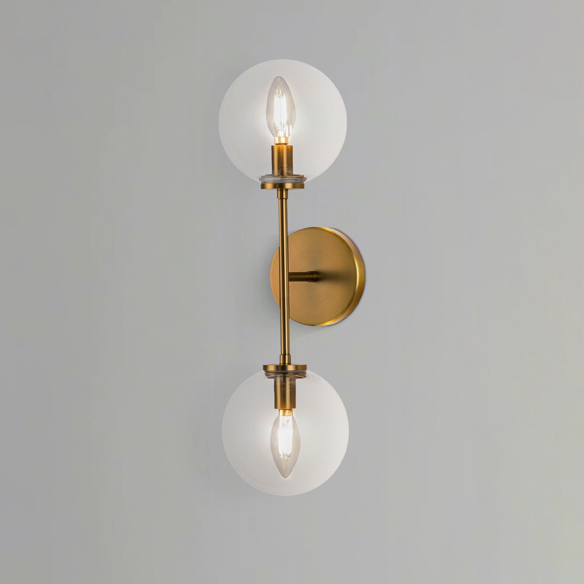 Stacked globes form a clear vertical marker in this two-light wall/vanity light. Illumination moves upward and downward at the same time so the whole room brightens without harsh points. A compact center mount keeps the line unbroken whether the fixture is on or off. When lit, the forms shimmer softly, and at rest the outline stays spare and tidy.