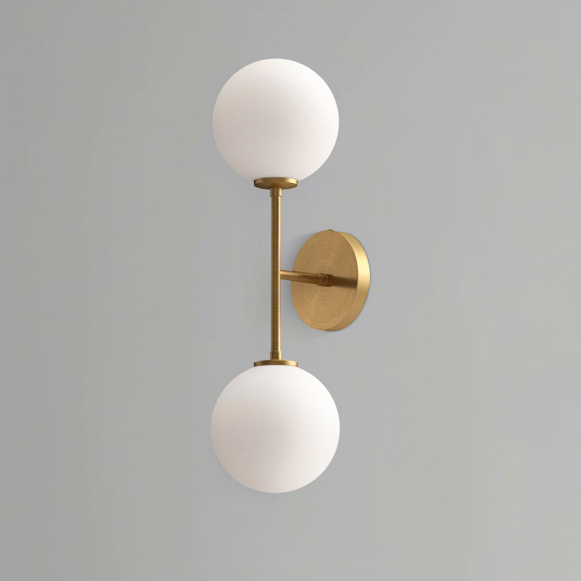 Stacked globes form a clear vertical marker in this two-light wall/vanity light. Illumination moves upward and downward at the same time so the whole room brightens without harsh points. A compact center mount keeps the line unbroken whether the fixture is on or off. When lit, the forms shimmer softly, and at rest the outline stays spare and tidy.