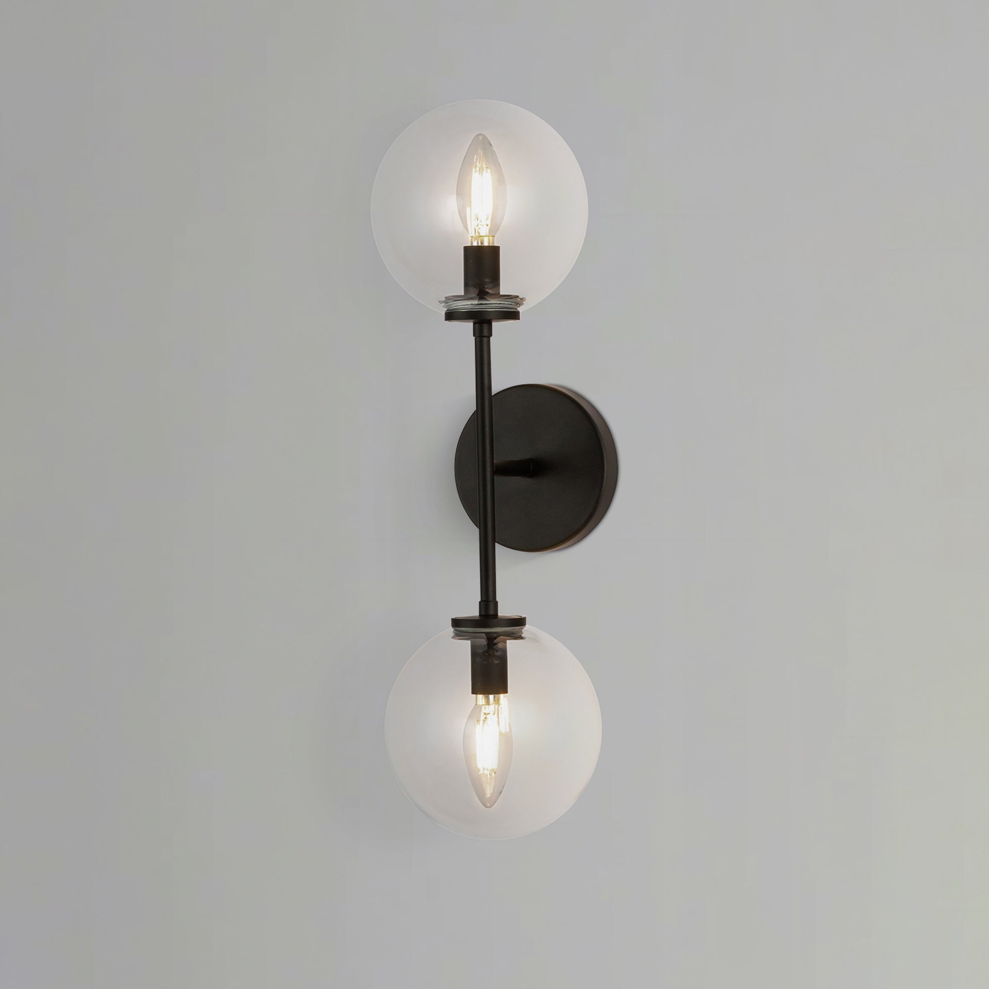 Stacked globes form a clear vertical marker in this two-light wall/vanity light. Illumination moves upward and downward at the same time so the whole room brightens without harsh points. A compact center mount keeps the line unbroken whether the fixture is on or off. When lit, the forms shimmer softly, and at rest the outline stays spare and tidy.