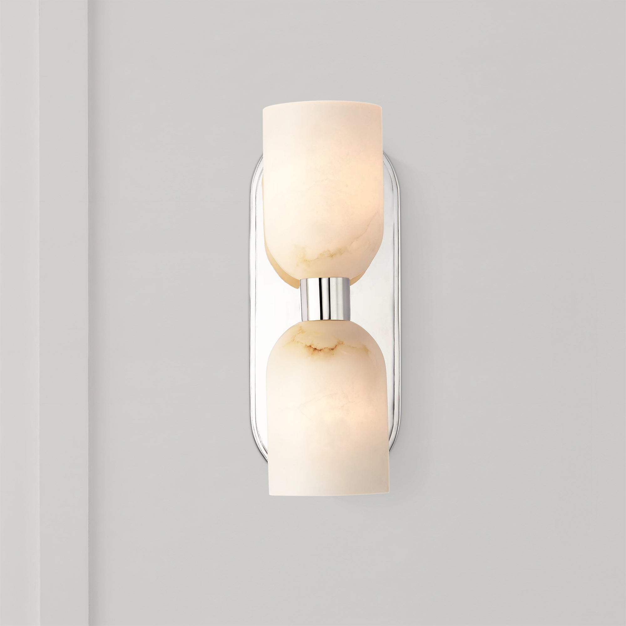 - A capsule-style two-light wall light brings sculptural symmetry and an inviting glow
