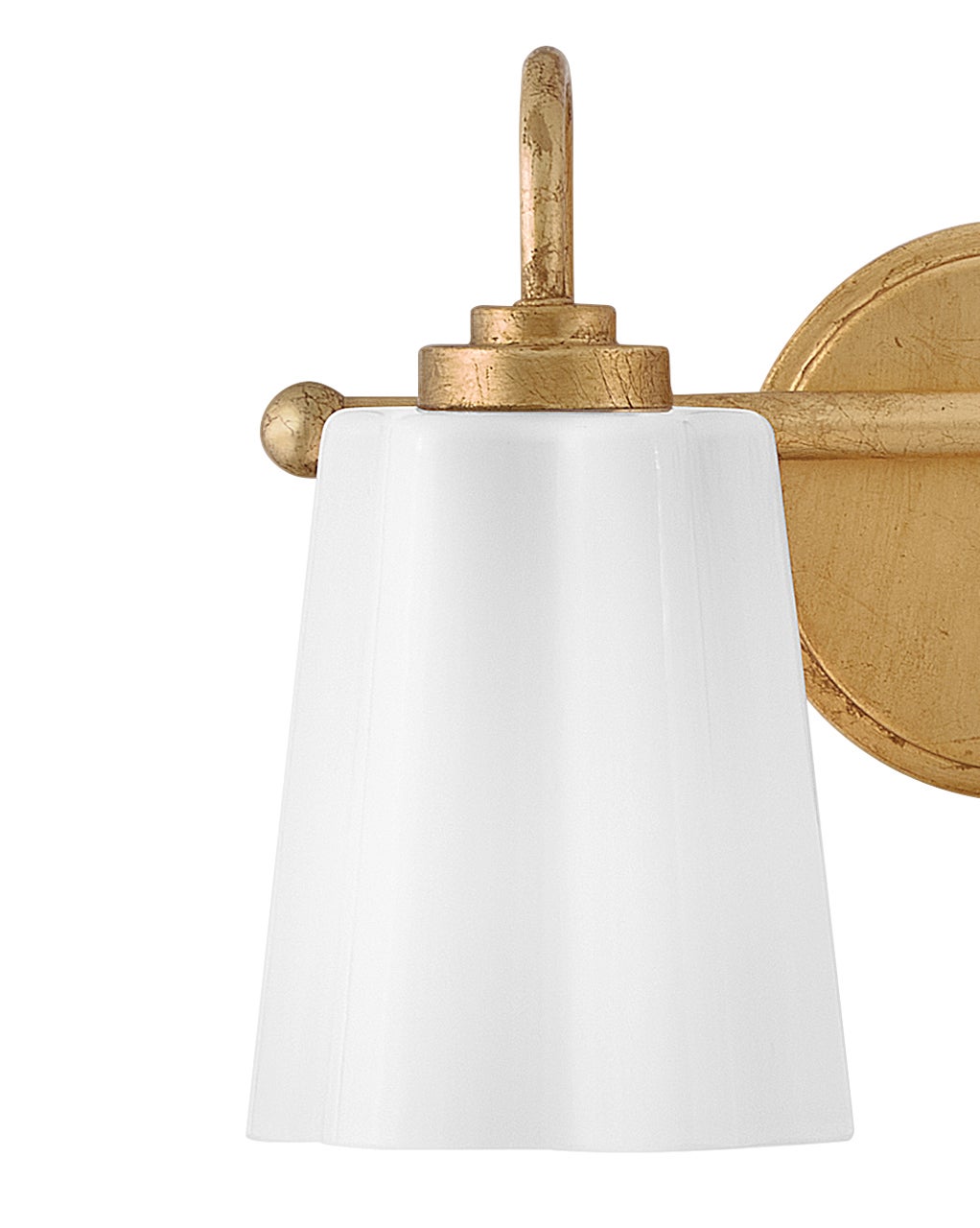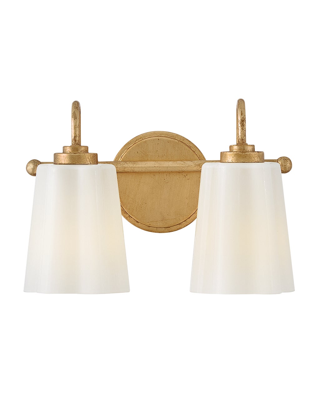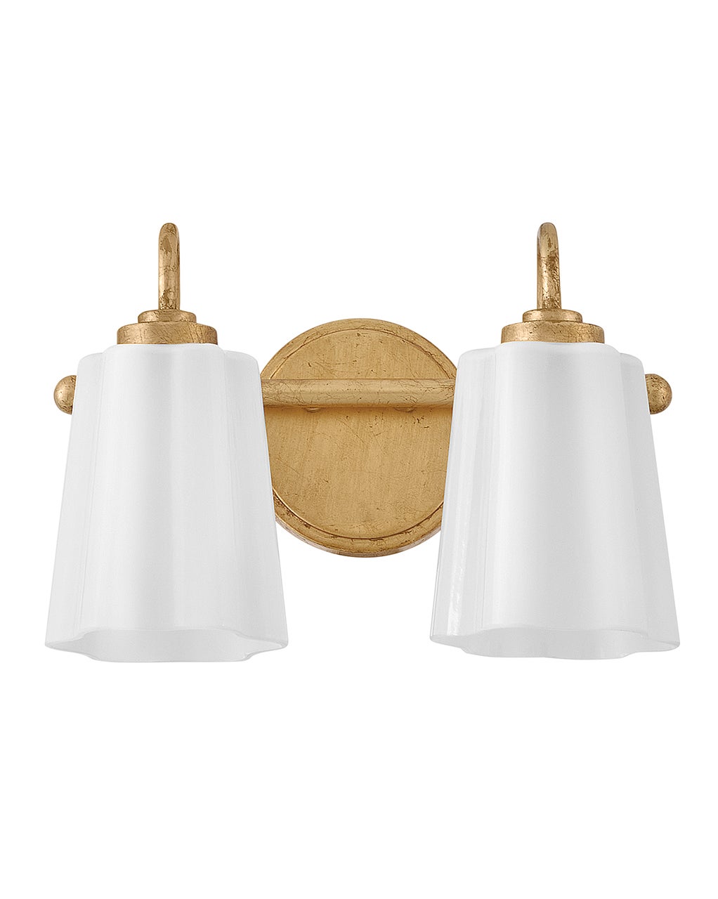 - A whimsical two-light bathroom vanity fixture floats soft light above the mirror