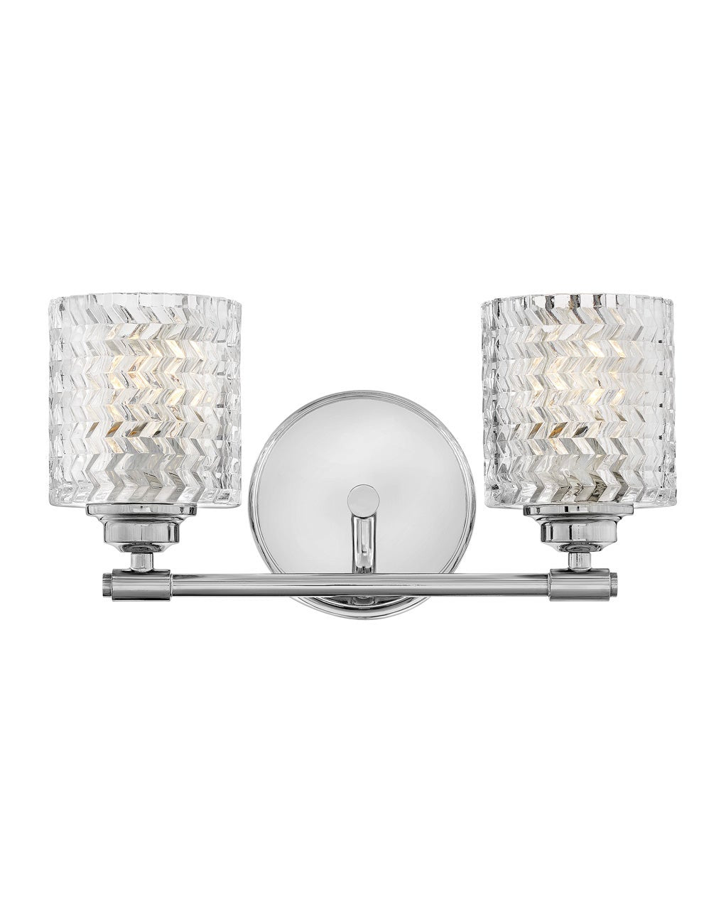 Brighten a vanity with this charming traditional two-light bath sconce. Rich in detail and artistry, it showcases a pair of chevron-cut glass shades that sparkle in the light. A stepped wall plate and decorative post complete the look with refined artistry and elegance. For added versatility, this fixture can be installed with its lights pointed up or down for just the right ambiance.
