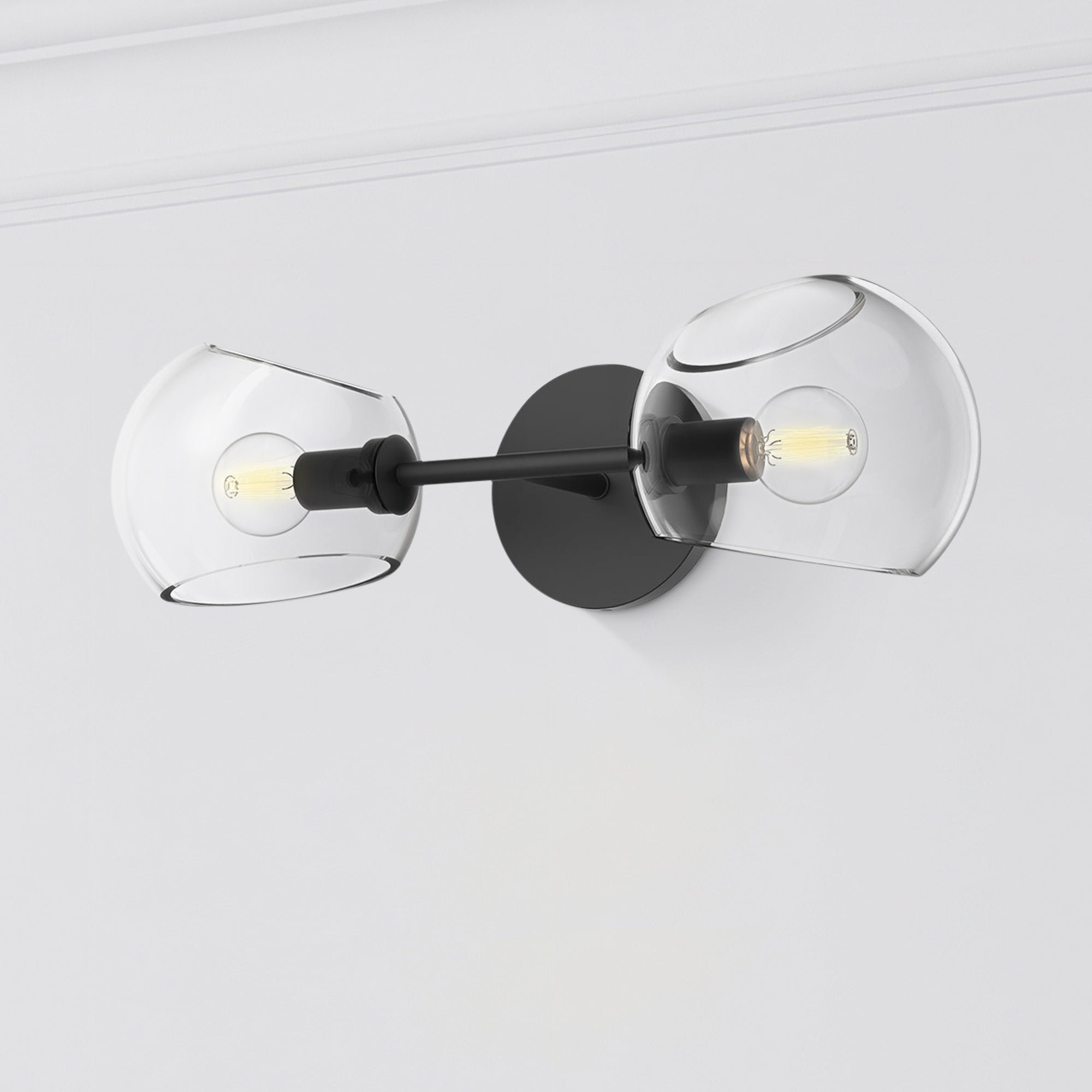 Twin half-domes mirror each other in this two-light wall/vanity light, forming a balance beam of light. Each opening casts light outward, so coverage widens and shadows soften across the span. A straight center rod anchors the layout with a clear, architectural gesture. Lively and symmetrical, it supports daily routines with dependable brightness.