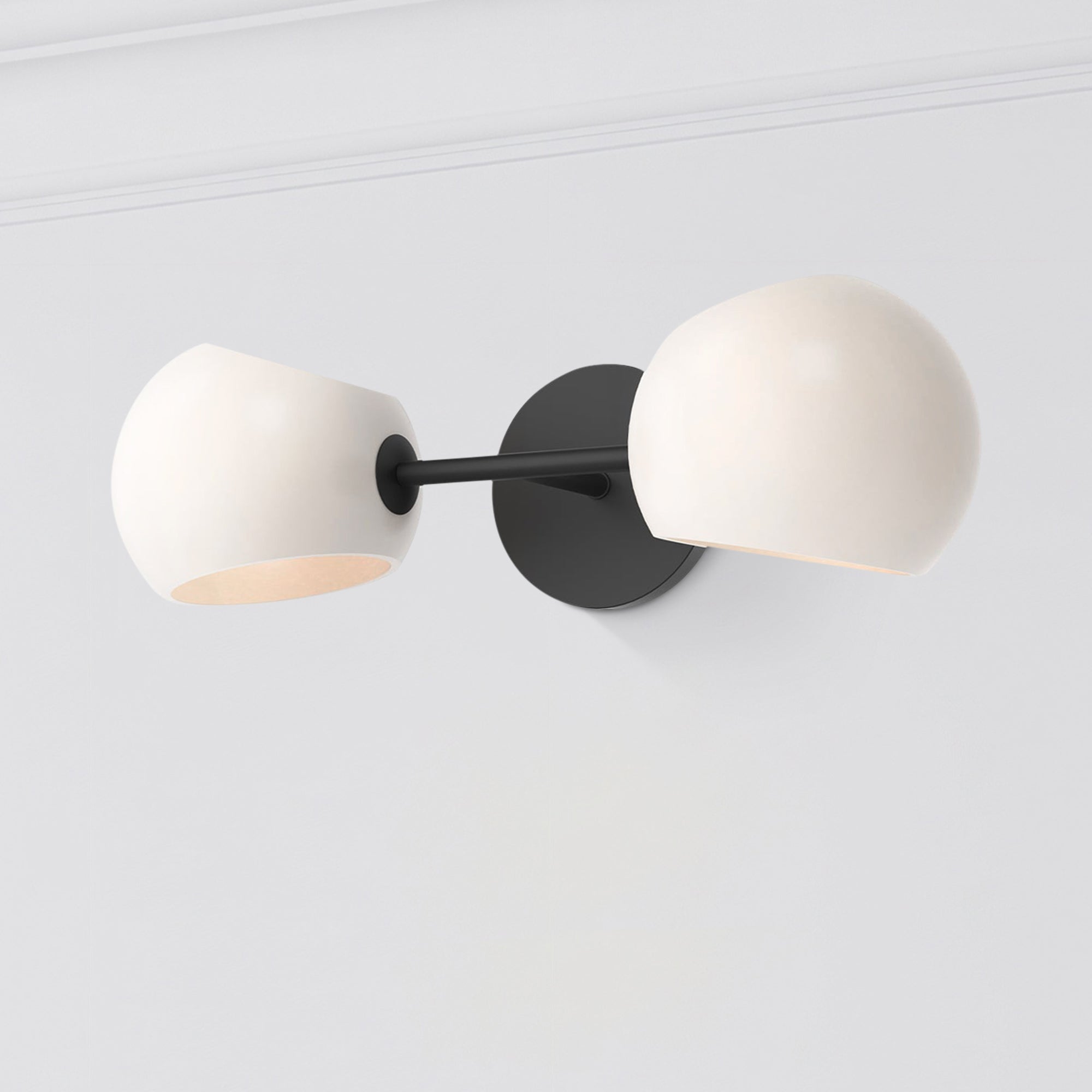 Twin half-domes mirror each other in this two-light wall/vanity light, forming a balance beam of light. Each opening casts light outward, so coverage widens and shadows soften across the span. A straight center rod anchors the layout with a clear, architectural gesture. Lively and symmetrical, it supports daily routines with dependable brightness.
