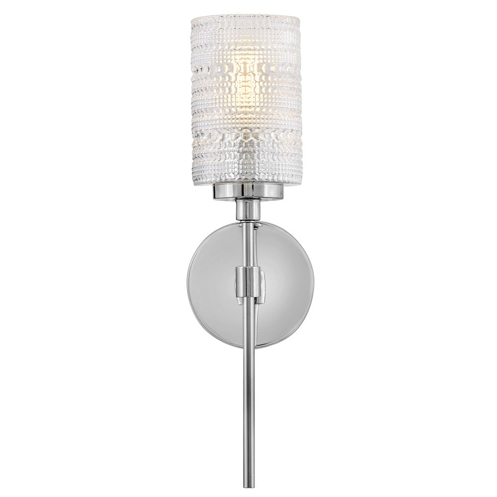 Vintage charm and modern sparkle come together in this single wall sconce, where clear hobnail glass crowns a slender metal stem. The tall profile lends a sense of refinement, making it a lovely companion for mirrors, artwork, or architectural niches. Its simple round backplate and slim arm keep the look airy enough for small spaces while still feeling special. Whether flanking a vanity or accenting a hallway, it brings a touch of collected character to the home.