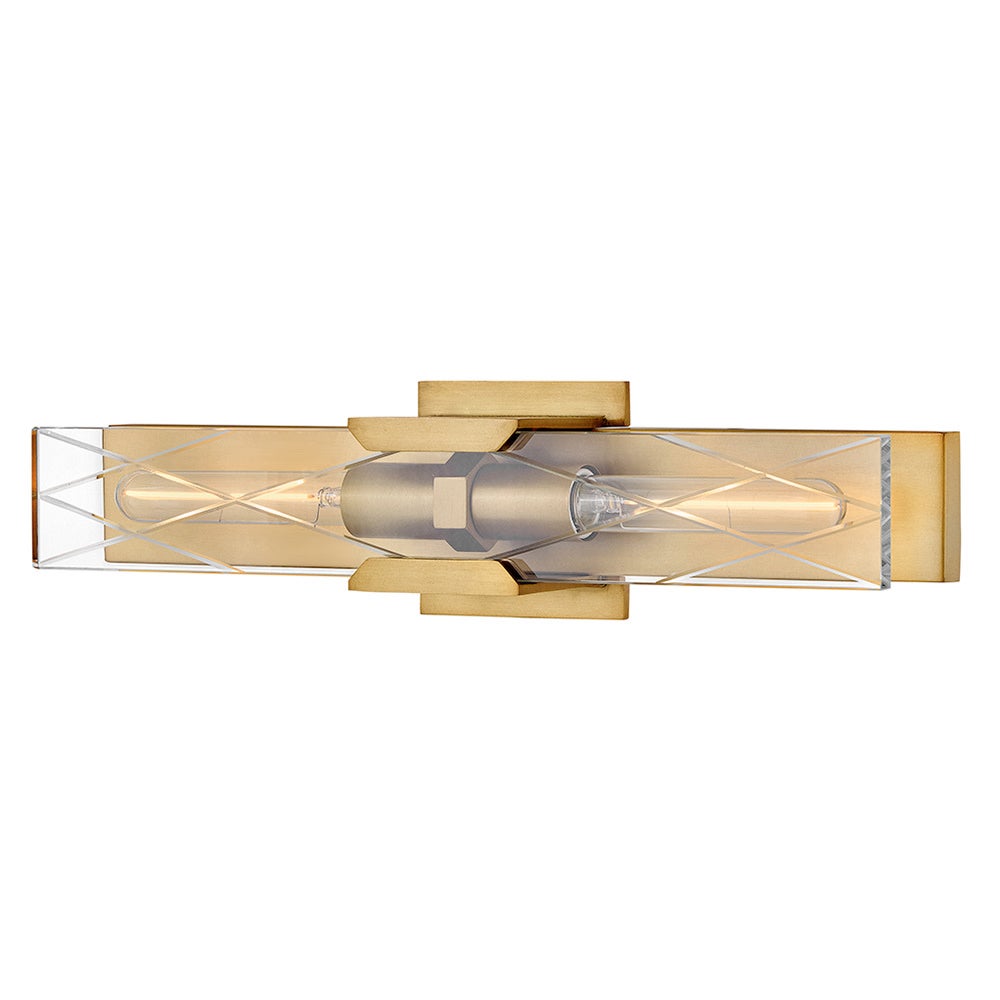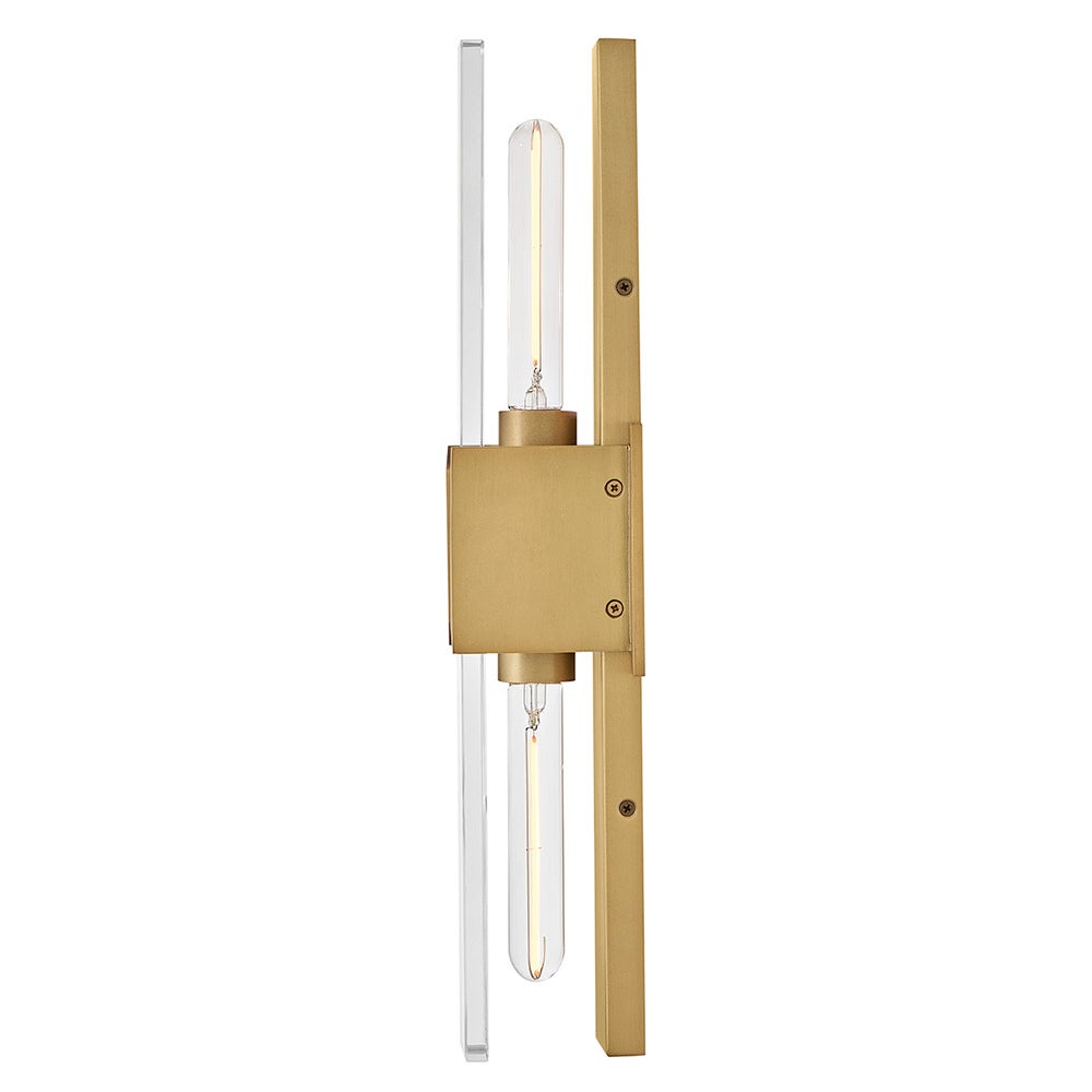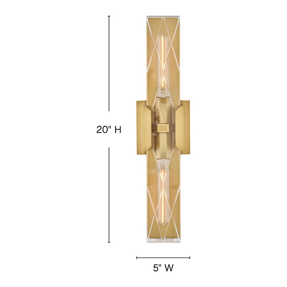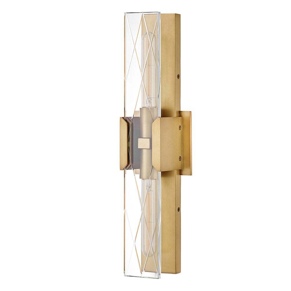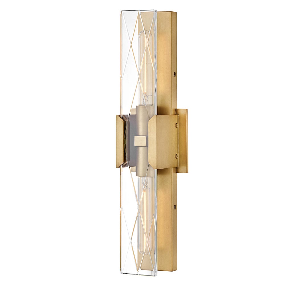 - Polished geometry and sparkling glass create drama with this large two-light wall sconce