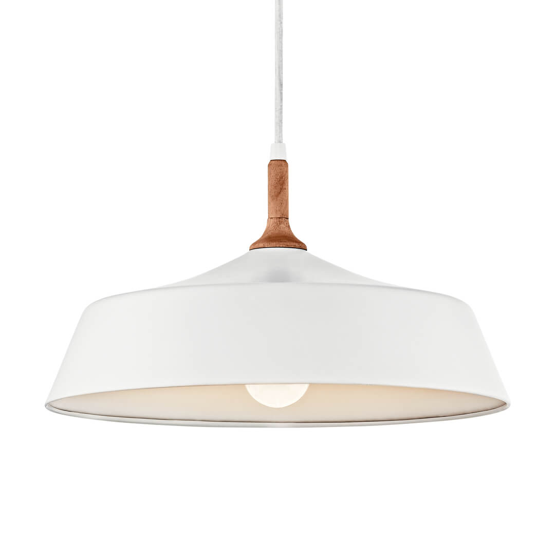 A cool finish is augmented with the organic appeal of wood accents on this modern pendant light. Its wide shade casts bright, even illumination, perfect for dining spaces and eat-in kitchens. Blending hints of mid-century and modern design schools, this pendant has a truly timeless look and feel in any home.