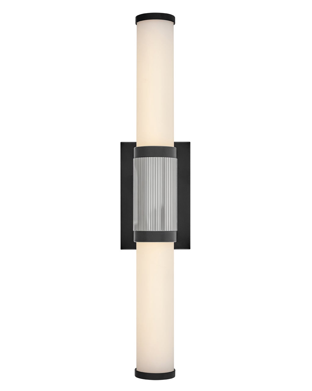 A decorative finish and lovely ribbed cuff accentuate the impeccable, streamlined silhouette of this modern two-light LED wall sconce. Energy efficient and low maintenance, it features a double-torch silhouette with a pair of etched opal glass batons and easily installs vertically or horizontally to create the perfect look in every setting. Add a pair of flanking a vanity mirror for beautiful illumination of all your daily beauty and grooming tasks.
