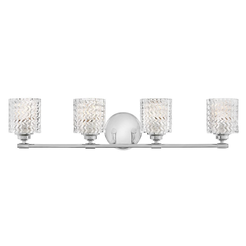 Capture the essence of traditional glamour with this charming four-light vanity fixture. It brings a luxurious ambiance with chevron cut glass that radiates sparkle and sophistication across your vanity. A stepped wall plate adds character and luxe ambiance, while the ability to choose a lights-up or down installation leaves room for customization in your space. It's a distinctive choice from the exceptional Tempo collection.
